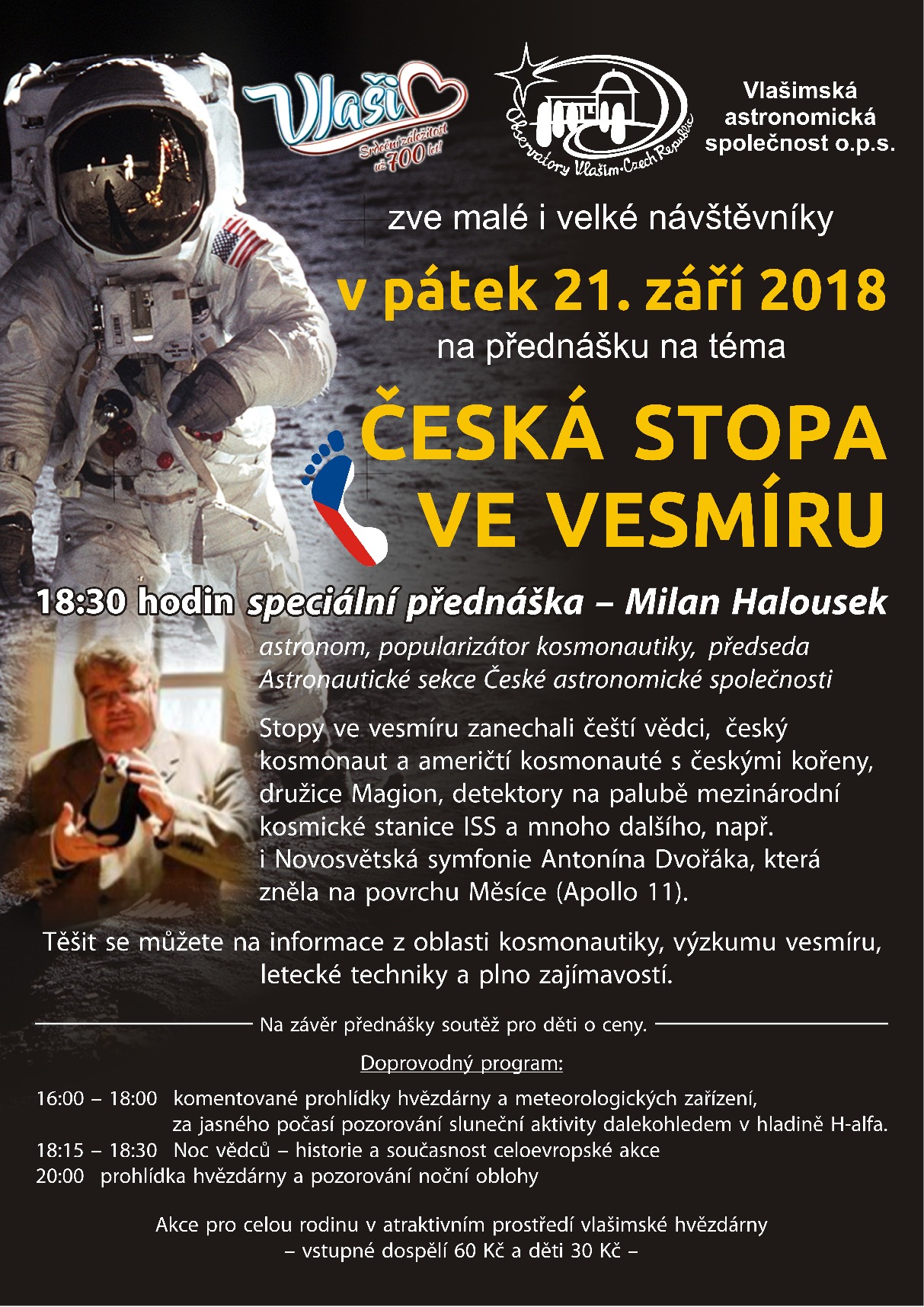SPECIÁLNÍ PŘEDNÁŠKA 18:30 - 19:30 přednáška Milana Halouska "Česká stopa ve vesmíru". Na závěr přednášky soutěž pro děti o ceny.