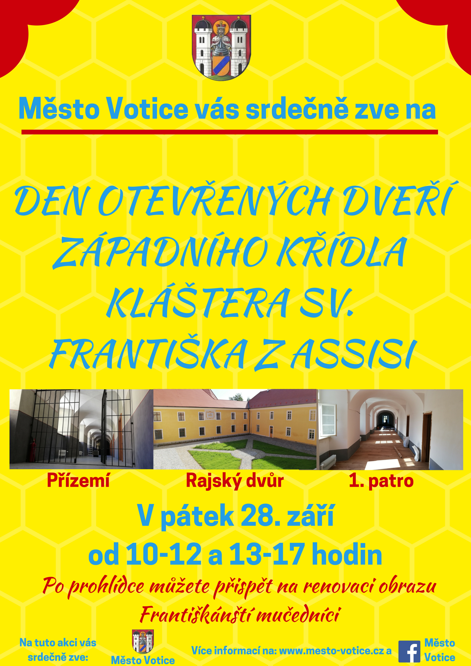 Votice - Zveme vás na den otevřených dveří do nově zrekonstruovaných prostor západního křídla kláštera sv. Františka z Assisi a na rajský dvůr. Pro veřejnsot bude otevřeno v pátek 28. září od 10 do 12 a od 13 do 17 hodin. Vstup zdarma.