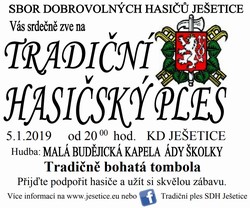 SDH Ješetice zve na ples s bohatou tombolou do KD Ješetice. Hraje Malá budějcká kapela Ády Školy,