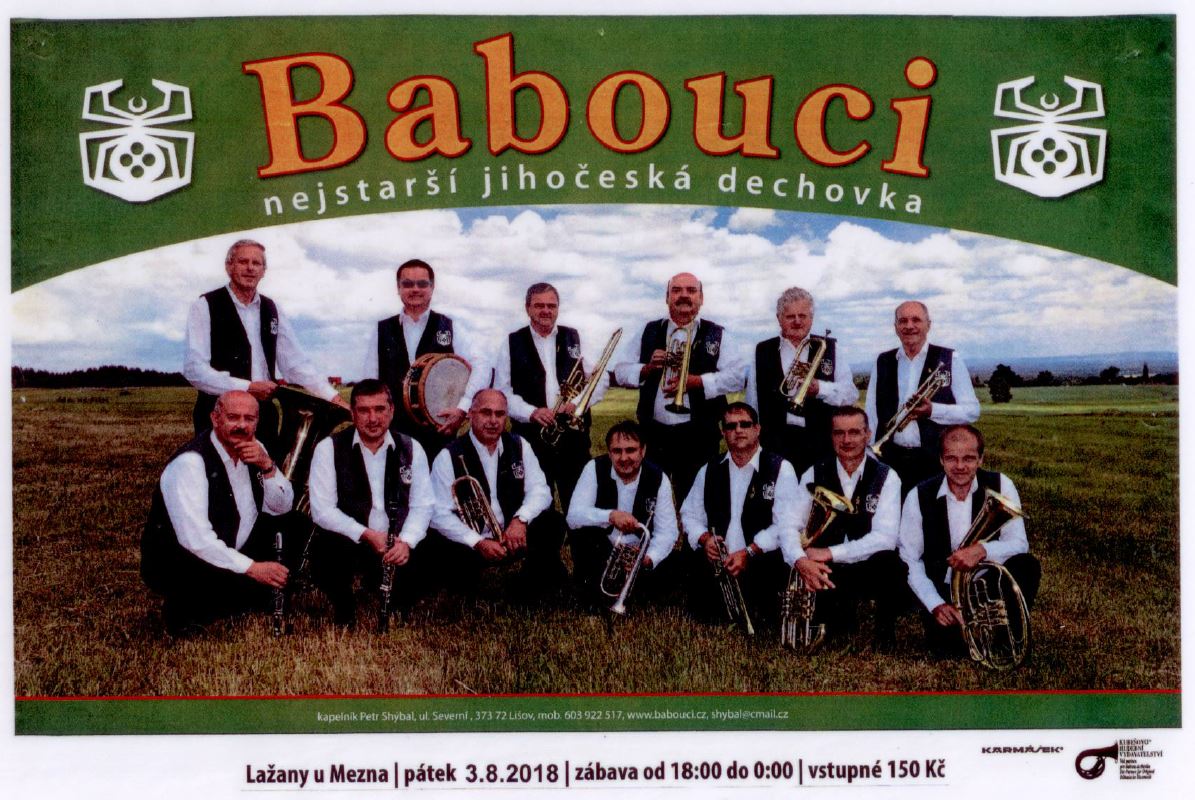 V osadě Lažany u Mezna se uskuteční venkovní koncert a taneční zábava s jihočeskou dechovkou Babouci. Organizační pokyny na www.mezno.cz