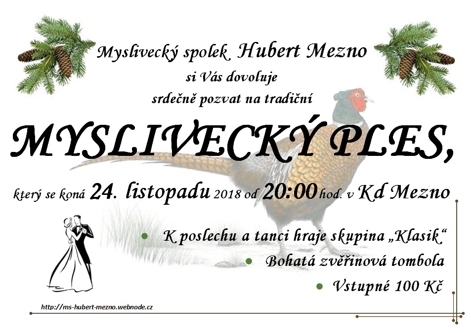 Myslivecký spolek Hubert Mezno vás zve na tradiční ples v sále KD Mezno. Hraje skupina Klasik.