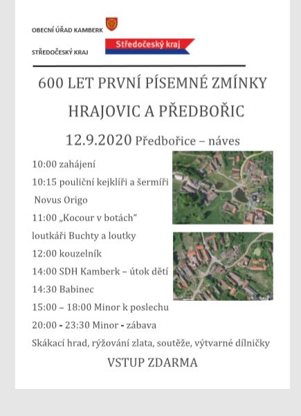 Na návsi v Předbořicích se bude konat Oslava 600 let první písemné zmínky Hrajovic a Předbořic.