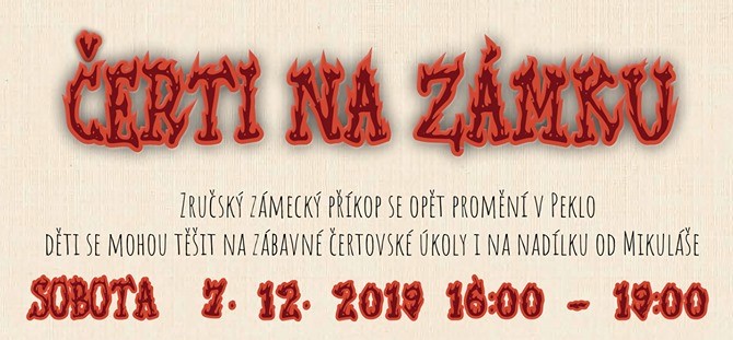 Pátý ročník akce Čerti na zámku. Lucifer a čerti si připravili pro děti čertovské úkoly v zámeckém příkopu, Mikuláš s anděly už chystají balíčky s dobrotami pro hodné děti a čertovská babička sbírá recepty na různé dobroty do své cukrárny. Nezapomeňte si rezervovat čas vstupu do pekla na www.certinazamku.cz, rezervace bude možná od 4. 11. 2019. Těšíme se na vás!