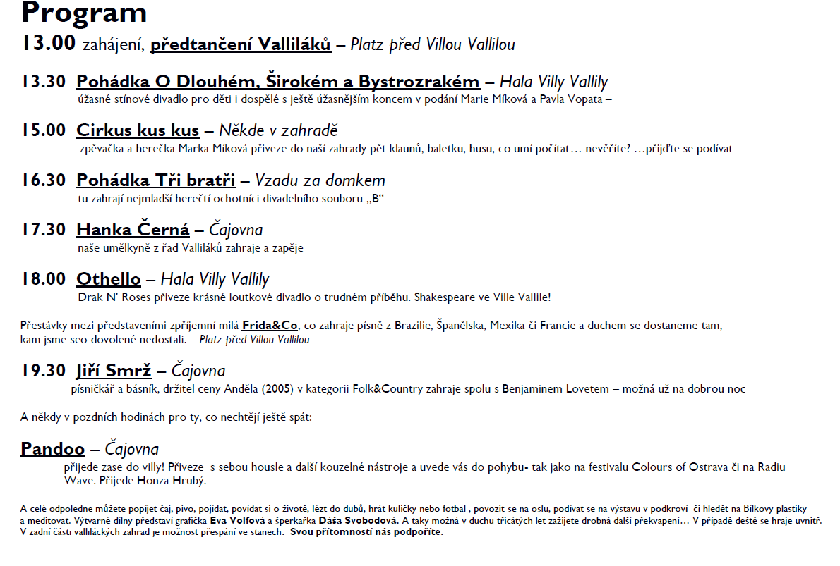 3.9. 2016 od 13:00 se uskuteční Zahradní slavnost ve Ville Vallile v Červeném Újezdě u Votic. Těšit se můžete na divadlení představení pro malé i velké, hudební předstvení, občerstvení, hry, výstavu v podkroví, výtvarné dílny grafičky Evy Volfové a šperkařky Dášy Svobodové.