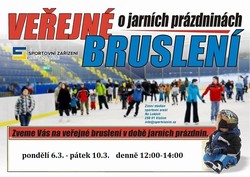 I v letošní sezóně jsme si pro Vás o jarních prázdninách připravili několik mimořádných veřejných bruslení v odpoledních hodinách. Tato bruslení se budou konat každý všední den od pondělí 6.3. do pátku 10.3. – vždy od 12:00 do 14:00.