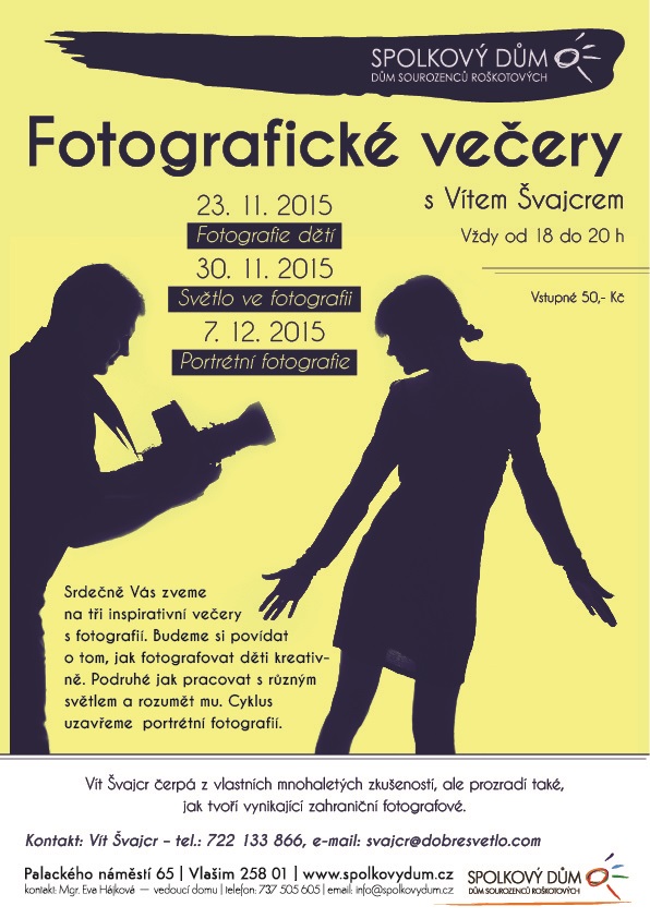 Srdečně Vás zveme na tři inspirativní večery s fotografií. Budeme si povídat o tom, jak fotografovat děti kreativně. Podruhé jak pracovat s různým světlem a rozumět mu. Cyklus uzavřeme portrétní fotografií. Vít Švajcr čerpá z vlastních mnohaletých zkušeností, ale prozradí také, jak tvoří vynikající zahraniční fotografové.Vstupné 50,- Kč.
