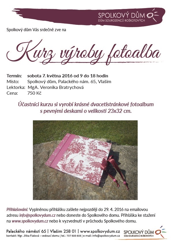 Účastníci si na kurzu vyrobí krásné dvacetistránkové fotoalbum s pevnými deskami o rozměru 23x32 cm. Kurz vede MgA. Veronika Bratrychová. Cena: 750 Kč. Přihlašování a informace na info@spolkovydum.cz a 737 505 605.